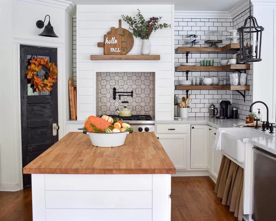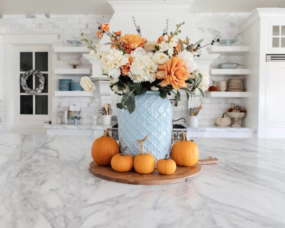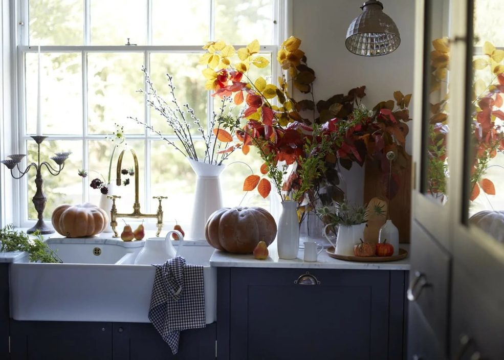 برای پائیزی کردن دکور آشپزخانه می توانید در سینی های دکوراتیو در گوشه آشپزخانه خود استفاده کنید. کابینت تمام چوب انتخاب عالی برای شما است و اگر فقط میخواهید تزئینات پائیزی داشته باشید، می توانید از بانک های چوبی در کنار تخت سرو های چوبی استفاده کنید و در گلدانی در کنار آنها از برگ های پاییزی زرد و نارنجی بهره بگیرید و همچنین می توانید از قاب عکس هایی استفاده کنید در کنار بانکه ها که حال و هوای پائیزی دارند. یک یا چند کدوی نارنجی کوچک و زیبا می تواند نماد خیلی زیبایی از پاییز در آشپزخانه شما باشد.