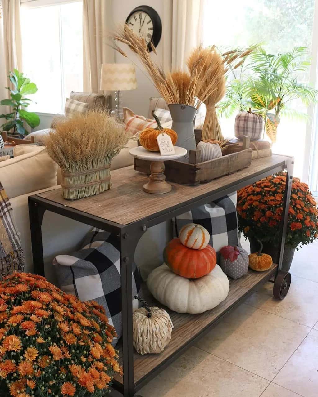 دکوراسیون  پاییزی پذیرایی برای این است که حال و هوای پذیرایی خود را پائیزه کنید و به وسایل چندان زیادی احتیاج ندارد. می توانید از یک میز جلو مبلی چوبی کمک بگیرید و روی آن را با شمع های قرمز و نارنجی تزیین کنید همچنین از کدو و میوه های پاییزی کمک بگیرید میوه های درختان که در پاییز وجود دارد می‌تواند انتخاب مناسبی باشند در قدم بعدی می توانید از کوسن هایی با پترن های چهارخانه و جنس های بافت و گرم استفاده کنید که حال و هوای پاییزی را به خانه خود دعوت کنید. همچنین از شال مبل هایی با همین طرح و جنس می توانید استفاده کنید.