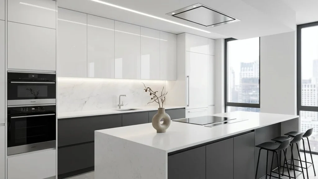 طراحی آشپزخانه مدرن بر خطوط صاف، طراحی تخت و استفاده از سطوح ساده و یکپارچه تأکید دارد.