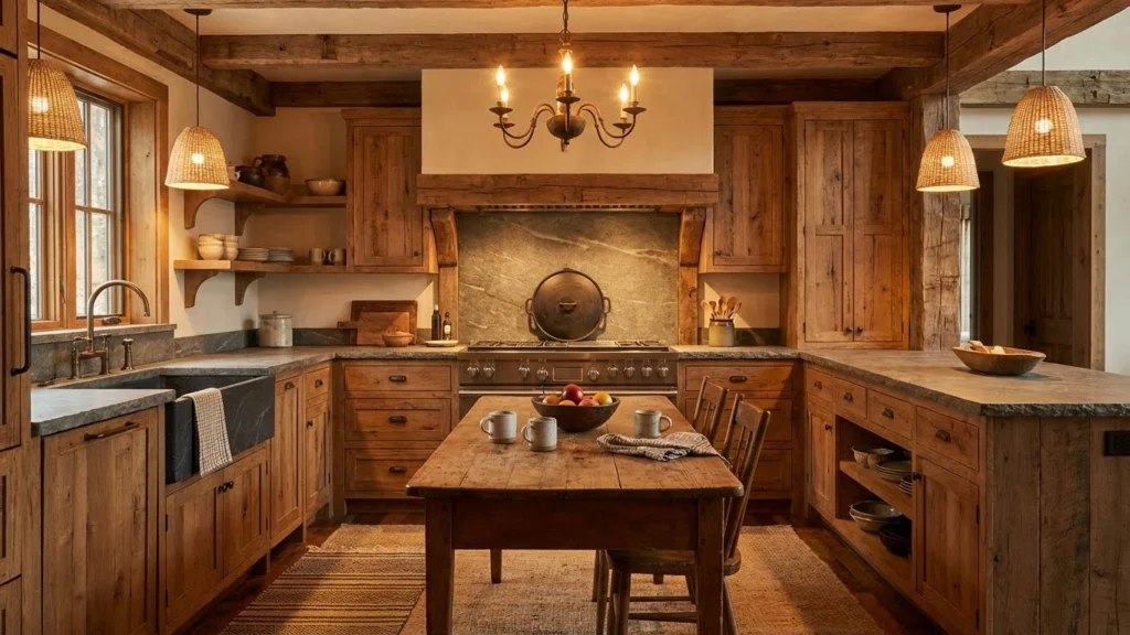 - متریال و بافت: متریال غالب در دیکوریشن آشپزخانه روستیک، مواد طبیعی و دستساز مانند چوب فرآوری نشده و سنگ است.