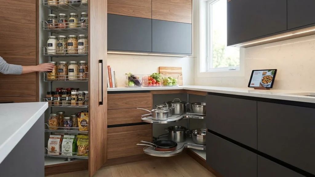- راهکارهای هوشمند کنج: کنجهای کابینت میتوانند با یراقآلات پیشرفتهای مانند قفسههای چرخشی مجهز شوند تا دسترسی به وسایل در عمق گوشه آسانتر شود.