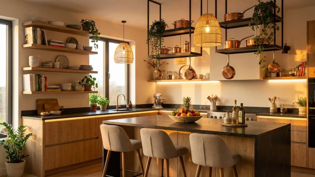شلفهای باز عنصری کلیدی در تزیین آشپزخانه مدرن هستند. شلفهای آویزان از سقف بالای جزیره، علاوه بر فراهم کردن فضای ذخیرهسازی، میتوانند جایگزین جذابی برای لوسترها در عکس دکوراسیون آشپزخانه باشند. همچنین توجه به دکور ورودی آشپزخانه با استفاده از شلفهای دکوراتیو میتواند جذابیت بصری فضا را دوچندان کند.