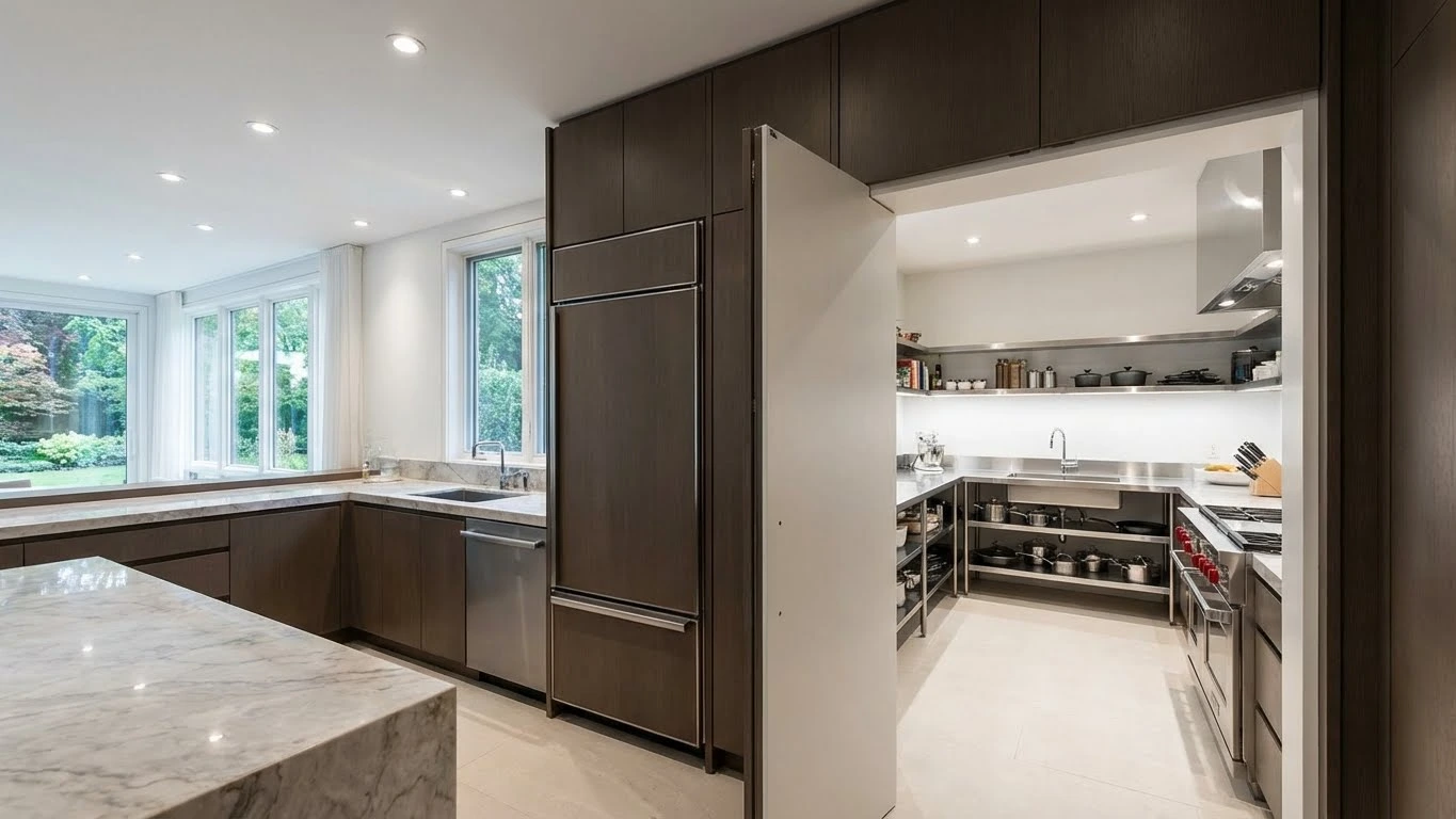 در خانههای لوکس، تمایل به داشتن فضاهای مجزا مانند مطبخ (فضای پختوپز مخفی) افزایش یافته است. مطبخ برای پختوپز پرحجم و شستشوی ظروف طراحی میشود تا دکوراسیون آشپزخانه مدرن اصلی همیشه تمیز و مرتب باقی بماند. همچنین اتاق لباسشویی فضایی حیاتی برای نگهداری لوازم نظافت است که باید در طراحی دکوراسیون داخلی اشپزخانه های بزرگ در نظر گرفته شود.