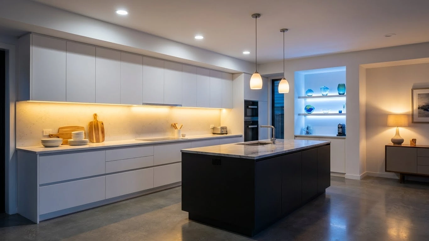 در دیزاین آشپزخانه شیک، نورپردازی باید بهصورت لایهای اجرا شود: