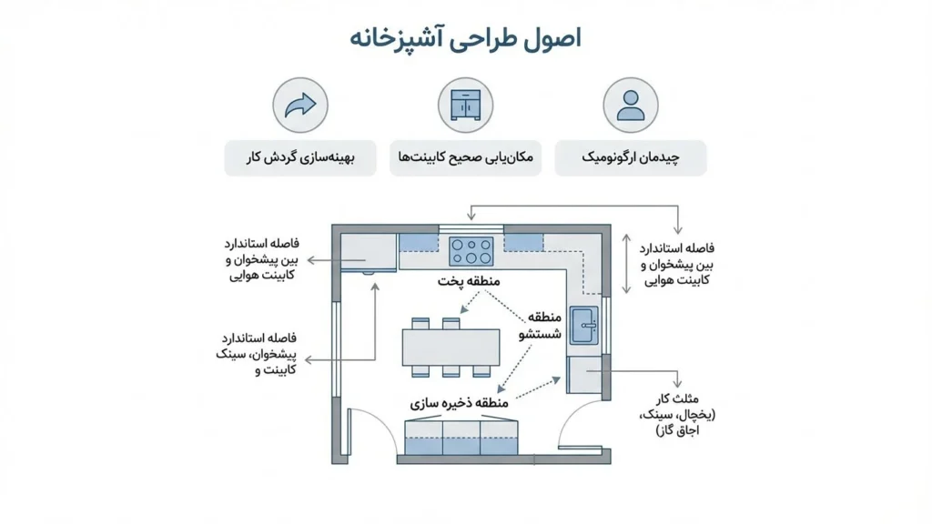 زیبایی و کارایی یک دکوراسیون داخلی آشپزخانه، پیش از هر چیز به رعایت اصول چیدمان صحیح و مهندسی ارگونومیک بستگی دارد.
