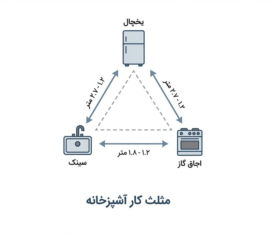 مثلث کار، یک اصل بنیادین در طراحی دکوراسیون آشپزخانه است که بهمنظور بهینهسازی جریان کار و کاهش مسافت پیموده شده توسط آشپز تعریف شده است. این مثلث شامل سه مرکز فعالیت اصلی است: یخچال (بخش نگهداری)، سینک (آمادهسازی و شستشو) و اجاق گاز (پختوپز).