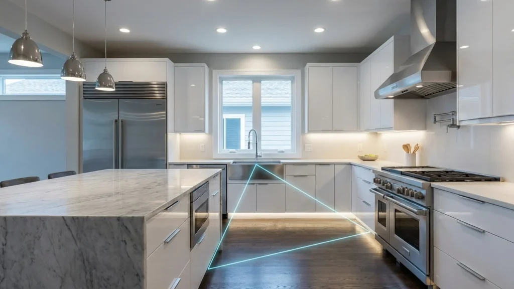 برای اجرای مؤثر این قانون طلایی در دکوراسیون آشپزخانه جدید، رعایت ابعاد استاندارد ضروری است: فاصله بین هر رأس مثلث نباید کمتر از حد مجاز باشد تا فضای کافی برای حرکت روان و باز کردن دربها و کشوها فراهم شود. همچنین، برای جلوگیری از پیمایش بیشازحد و خستگی، مجموع سه ضلع مثلث نباید از حد استاندارد تجاوز کند.
