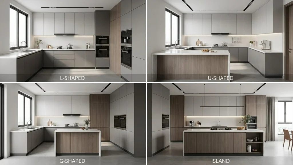 - آشپزخانههای U-شکل و G-شکل: این چیدمانها که فضای ذخیرهسازی بسیار زیادی را فراهم میکنند، این امکان را به طراح میدهند که سه نقطه اصلی را به بهترین نحو جانمایی کند. در چیدمان جی شکل، حتی میتوان دو مثلث طلایی طراحی کرد.