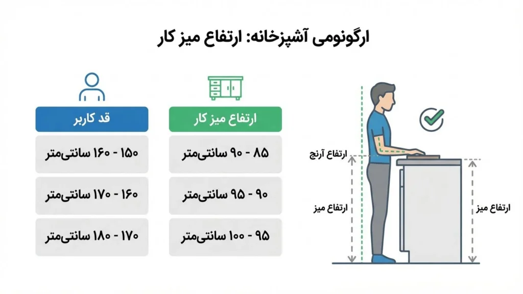 طراحی ارگونومیک تنها مختص ارتفاع کانتر نیست؛ بلکه شامل مواردی مانند فاصله بین سینک و اجاق، ارتفاع نصب هود، زاویه نورپردازی روی سطح کار، دسترسی سریع به ابزار پرتکرار، و حتی انتخاب نوع دستگیرهها نیز میشود. در پروژههای پیشرفته، این اندازهگیریها با توجه به پارامترهای واقعی مثل قد، قدرت دست، نحوه ایستادن هنگام آشپزی، و حتی سبک زندگی انجام میگیرد.