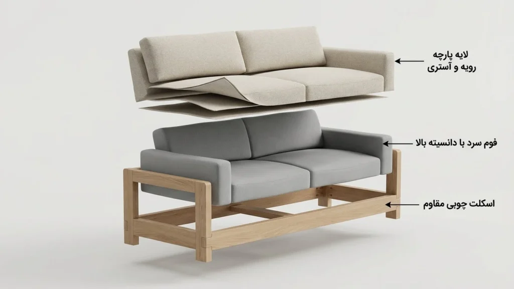 دوام یک دست سرویس مبل مینیمال در گرو سه جزء اصلی فنی است: اسکلت‌بندی (کلاف)، فوم نشیمن و پارچه روکش. در یک مبل راحتی سبک مینیمال، این اجزا باید از بالاترین کیفیت برخوردار باشند.