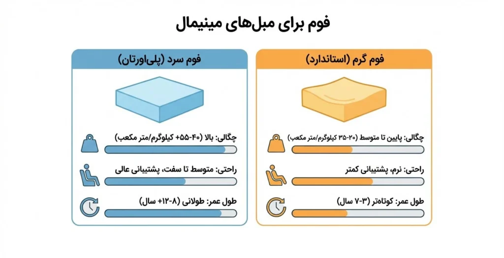 • مزیت فوم سرد: فوم سرد به دلیل دوام و ارتجاع قوی، گزینه بهتری نسبت به فوم گرم برای مبلمان راحتی مینیمال است. این فوم‌ها شکل خود را برای مدت طولانی‌تری حفظ می‌کنند و در صورت فشرده شدن، به سرعت به حالت اولیه باز می‌گردند. استفاده از فوم‌های فنری یا ترکیبی از فوم فنری و پشمی نیز برای افزایش کیفیت و دوام رایج است.