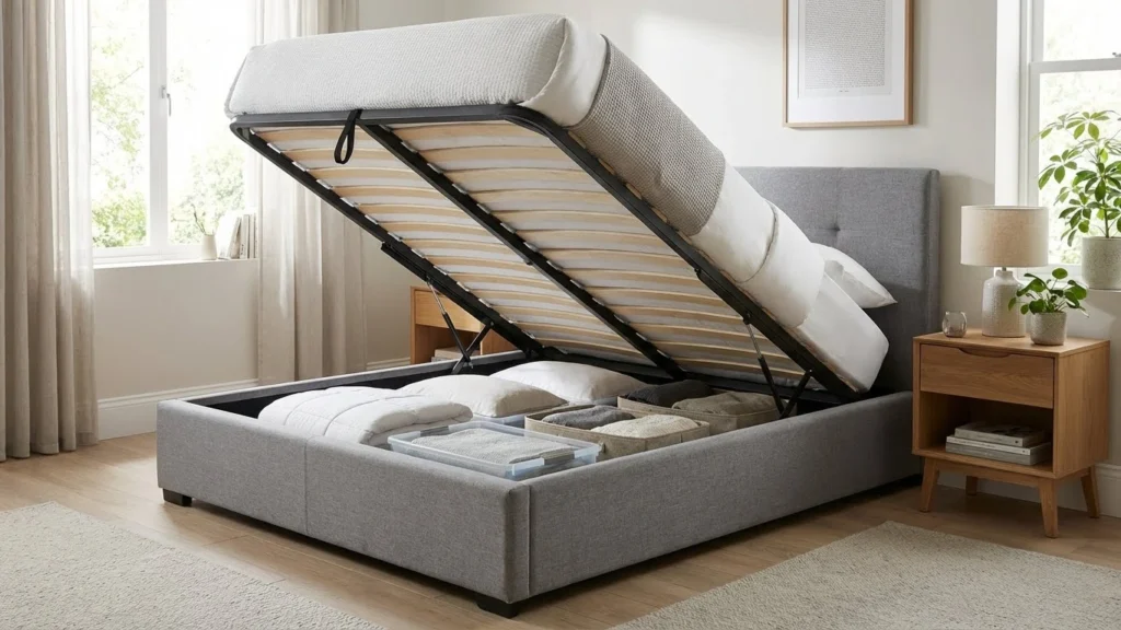 - تختخوابهای باکس و جکدار: در این مدلها، کفی و تشک به کمک یک جک هیدرولیکی به سمت بالا کشیده میشود و فضای زیر تخت، که معمولاً هدر میرود، به طور کامل برای نگهداری رختخواب، البسه فصلی یا دیگر وسایل مورد استفاده قرار میگیرد. اگر به دنبال تخت خواب دو نفره اسپرت جدید هستید، این مدلها عالی هستند.
