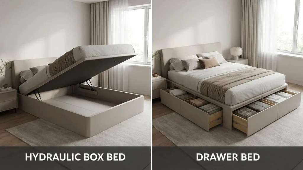 | فضای ذخیرهسازی | حجیم و یکپارچه (تمام زیر تخت) | تفکیکشده و محدودتر (فقط در اطراف قاب تخت) |