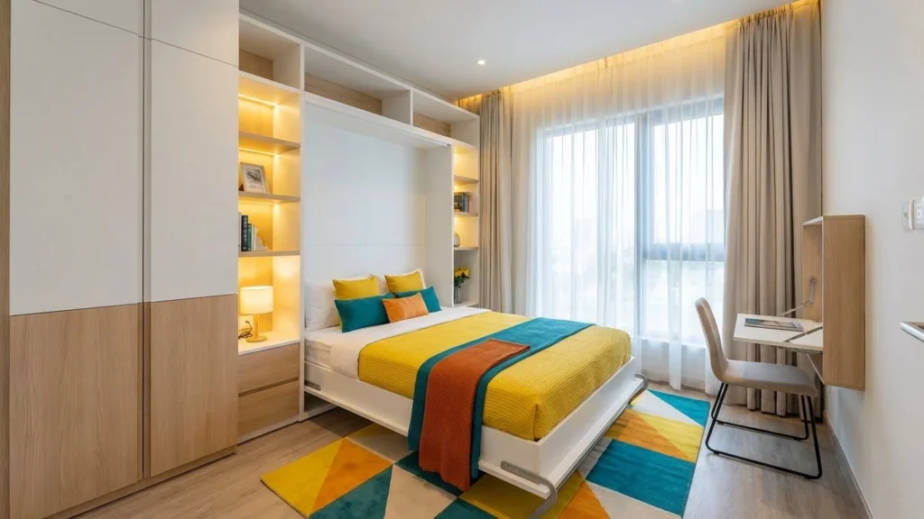 - تخت خواب تاشو (کمجا): در فضاهای بسیار کوچک، تختهای تاشو یا کمجا بهترین گزینه هستند. این تختها با استفاده از مکانیزم جک، در مواقع عدم نیاز به دیوار چسبیده و کاملاً فضای کف را آزاد میکنند.
