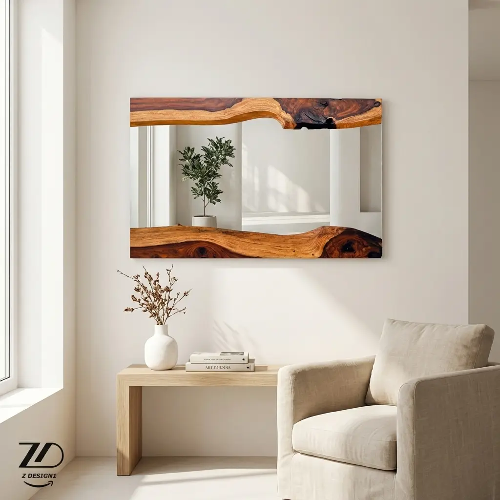 آینه روستیک از چوب طبیعی گردو ساخته شده که برش کالباسی از تنه درخت گردو می باشد .این سری از آینه های چوبی قطعا یک انتخاب زیبا و منحصر بفرد برای دکوراسیون روستیک یا حتی مدرن می باشند. این محصول را می تواند در سایزهای دیگر هم طراحی و ساخته شود، و حتی می تواند در سایزهای بسیار کوچک و یا بسیار بزرگ، با استفاده از چوب های طبیعی گردو ساخته شود.