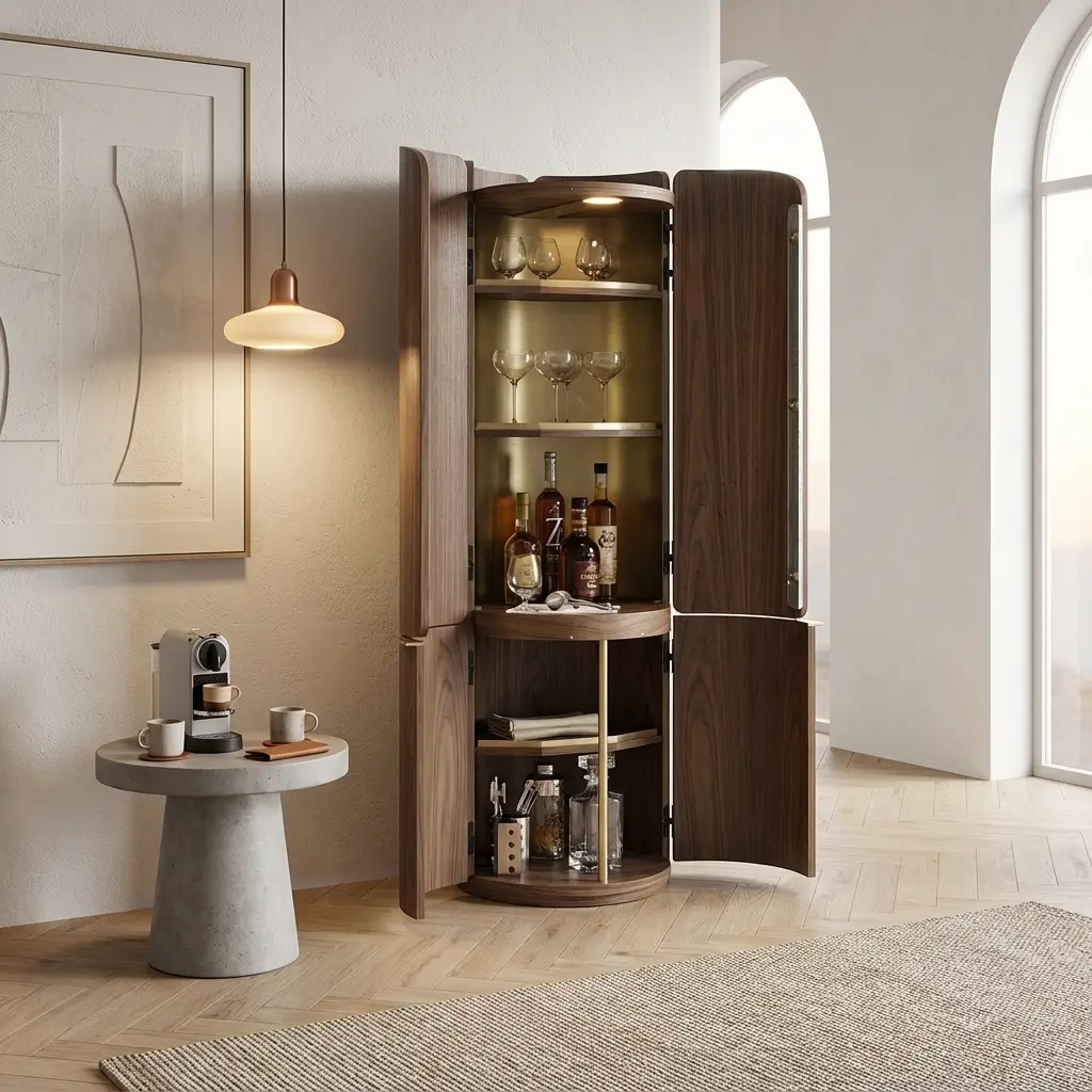 طراحی کافی بار گرد پانیز به گونهای است که تمام نیازهای شما برای یک ایستگاه قهوه خانگی را برطرف میکند. ارتفاع ۲۱۰ سانتیمتری آن، طبقات و فضای کافی را در اختیار شما قرار میدهد تا علاوه بر دستگاه قهوهساز، ماگها، شیشههای قهوه و اکسسوریهای تزئینی خود را به زیبایی چیدمان کنید.