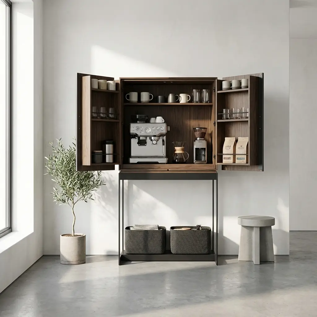 • طراحی کاربردی: فضای داخلی به گونه‌ای تقسیم‌بندی شده که امکان قرار دادن انواع بطری‌های بلند، ظروف و اکسسوری‌ها را فراهم می‌کند.