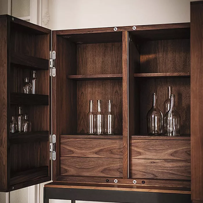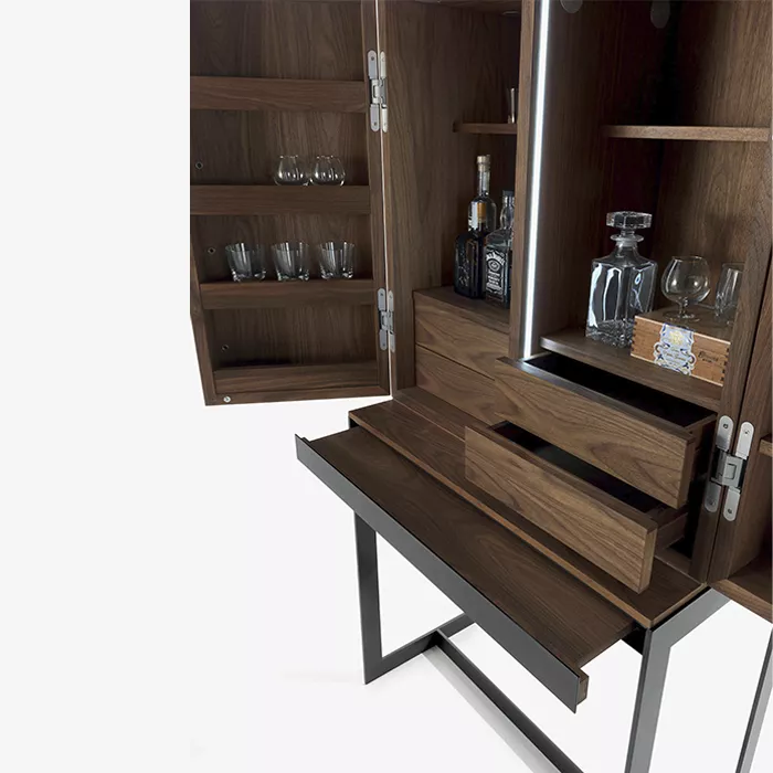 در ساخت بار چوبی لئون، کیفیت و ماندگاری حرف اول را می‌زند. بدنه این محصول از متریال مرغوب با ضخامت ۱.۶ سانتی‌متر ساخته شده که استحکام بالایی در برابر وزن لوازم چیده‌شده دارد. آنچه ظاهر این بار را متمایز می‌کند، استفاده از روکش چوب طبیعی گردو است. چوب گردو با رگه‌های طبیعی و رنگ گرم و عمیق خود، جلوه‌ای لوکس و در عین حال صمیمی به محصول بخشیده است.