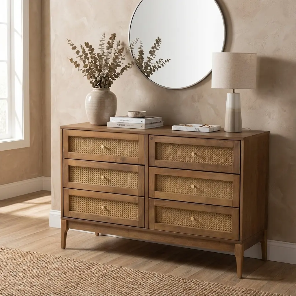 طراحی این دراور به گونه‌ای است که محدود به اتاق خواب نمی‌شود. به دلیل ظاهر شیک و ترکیب چوب و حصیر، می‌توانید از آن در فضای نشیمن یا راهروهای ورودی بزرگ نیز به عنوان یک کنسول کاربردی استفاده کنید. این مدل به خوبی با سبک‌های دکوراسیون بوهو (Boho)، روستیک، ساحلی و حتی مینیمال هماهنگ می‌شود. گرمای رنگ چوب راش و بافت ارگانیک حصیر بامبو، خشکی فضاهای مدرن را گرفته و روحی تازه به چیدمان منزل می‌بخشد.