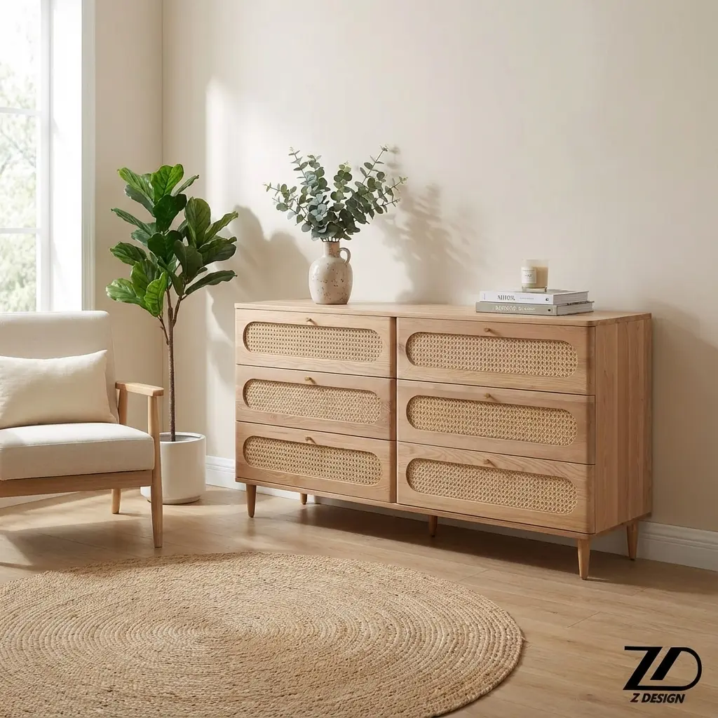 طراحی مینیمال و در عین حال پرکاربرد دراور شش کشو حصیری شمیم باعث شده تا استفاده از آن محدود به یک سبک خاص نباشد. این محصول به خوبی با سبکهای دکوراسیون بوهمیان (Boho)، اسکاندیناوی، روستیک و مدرن هماهنگ میشود. وجود حصیر در نمای کشوها، بافتی گرم و ارگانیک به فضا اضافه میکند که در کنار اکسسوریهای گیاهی و فرشهای نخی، ترکیبی بینظیر میسازد.
