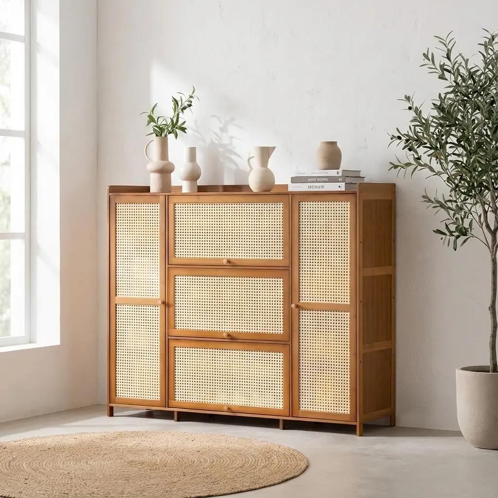 جاکفشی حصیری 26 نفره یکی از کاربردیترین و در عین حال زیباترین انتخابها برای نظمدهی به ورودی منزل یا اتاق رختکن شماست. اگر به دنبال محصولی هستید که علاوه بر گنجایش بالا، ظاهری مدرن و طبیعی داشته باشد، این مدل با طراحی خاص خود نظر شما را جلب خواهد کرد. ترکیب هوشمندانه چوب و بافت حصیری در نمای این محصول، حسی از سبک ژاپنی و بوهمین را به فضا منتقل میکند که با اکثر دکوراسیونهای امروزی همخوانی دارد. این جاکفشی با ابعاد متناسب خود (طول 120 و ارتفاع 110 سانتیمتر)، فضای کافی برای نگهداری حدود 26 جفت کفش را فراهم کرده و به شما کمک میکند تا همیشه محیطی مرتب و چشمنواز داشته باشید.