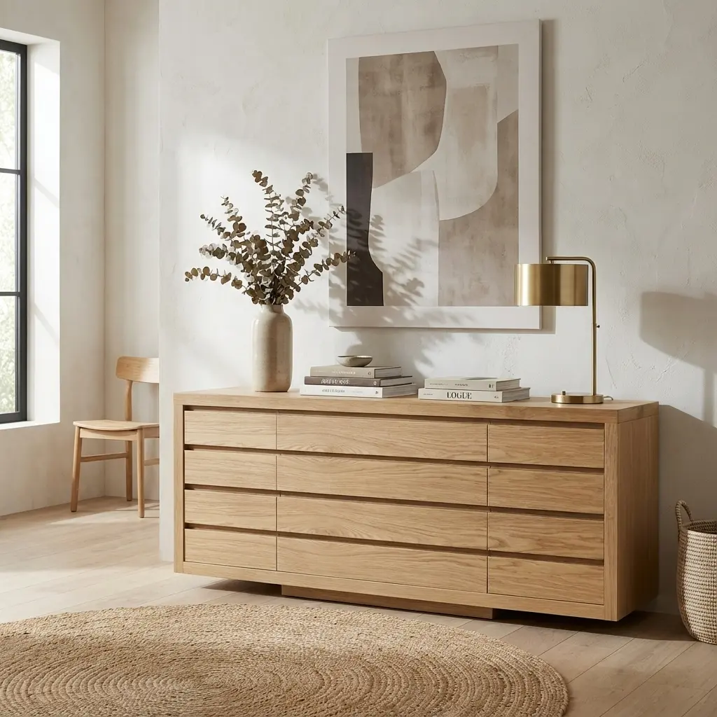 با توجه به ابعاد خاص دراور چوبی شیوان (طول ۲۲۰ و عرض ۵۰ سانتیمتر)، این محصول نیاز به فضایی دارد که بتواند خودنمایی کند. این دراور گزینهای ایدهآل برای اتاق خوابهای مستر (Master Bedrooms) بزرگ است، جایی که دیوارهای عریض نیاز به مبلمانی متناسب دارند. ارتفاع ۹۰ سانتیمتری آن نیز دسترسی راحت به کشوها و سطح رویی میز را فراهم میکند.