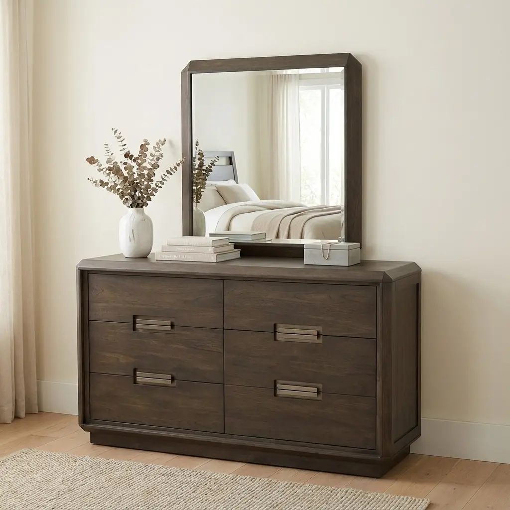 یکی از مزیت‌های اصلی این مدل، همراه داشتن یک آینه با ابعاد ۹۰ در ۹۰ سانتی‌متر است که هماهنگی کاملی با ابعاد بدنه دراور دارد و نیاز شما به خرید آینه جداگانه را برطرف می‌کند. کشوها با یراق‌آلات باکیفیت طراحی شده‌اند تا حرکتی روان و بی‌صدا داشته باشند. گوشه‌ها و لبه‌های کار با ظرافت پرداخت شده‌اند تا ضمن حفظ ظاهر طبیعی، ایمنی و لطافت سطح چوب حفظ شود.