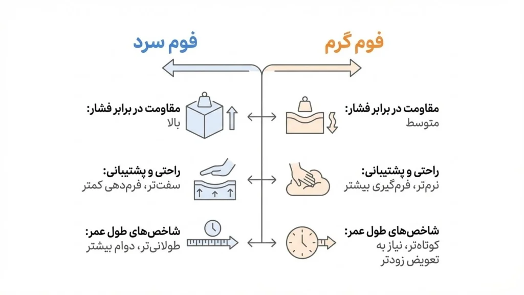 - تست تشخیص: فوم سرد با فشار دست سریع برمیگردد، اما فوم گرم با تاخیر.
